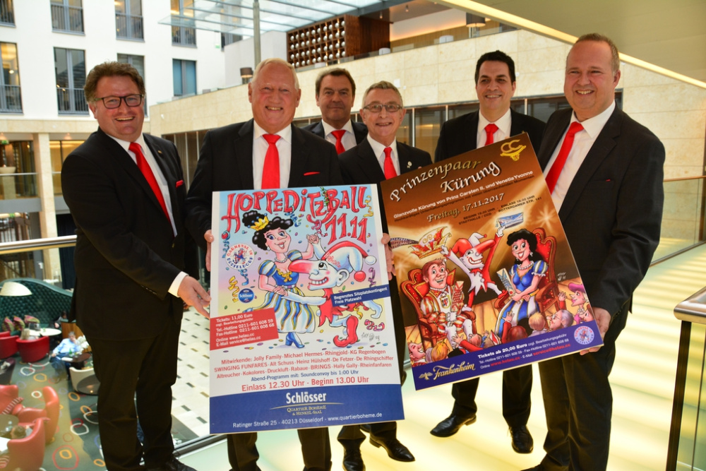 Viereinhalb Wochen müssen sich die Jecken noch gedulden, dann beginnt sie endlich, die „Fünfte Jahreszeit“: Zum Auftakt der Session 2017/2018 präsentiert das Comitee Düsseldorfer Carneval e.V. am Samstag, 11.11., nach dem traditionellen Hoppeditz-Erwachen auf dem Rathaushausplatz (Beginn: 11:11 Uhr) mit anschließendem Open-Air-Bühnenprogramm (Ende: 15:00 Uhr) ab 13:00 Uhr im Henkel-Saal und im Schlösser Quartier Bohème den fünften „Hoppeditz-Ball“. Während einer Pressekonferenz im Hotel InterContinental, an der auch Hoteldirektorin Britta Kutz teilnahm, sagte CC-Vizepräsident Stefan Kleinehr: „Wir laden dazu alle Freunde des rheinischen Karnevals herzlich ein, vor allem aber unsere Düsseldorfer Karnevalsgesellschaften.“ Gestaltet wird das Programm von 16 prominenten Bands und Künstlern. CC-Literat Klaus Use: „Unsere Gäste können sich auf Alt Schuss und De Fetzer ebenso freuen wie zum Beispiel auf Brings, KG Regenbogen, Heinz Hülshoff, Swinging Funfares, Michael Hermes, Rabaue und Kokolores.“ Anschließend wird Soundconvoy die Gäste bis 01:00 Uhr unterhalten. CC-Geschäftsführer Hans-Jürgen Tüllmann: „Trotz des tollen Programms kosten die Tickets unverändert 11 Euro zzgl. Vorverkaufsgebühr.“